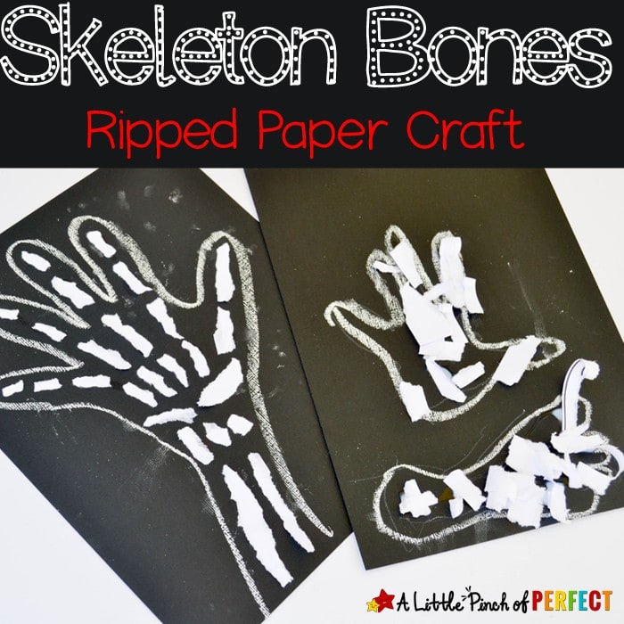 The Skeleton Bones Ripped Paper Craft by A Little Pinch of Perfect is a fun sensory activity. Moms will love that it strengthens fine motor skills as kids rip and glue paper. The final skeleton artwork makes a great Halloween display.