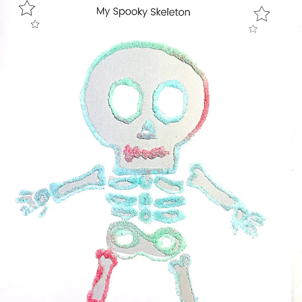 The Easy Skeleton Craft – Preschool Sand Art by Simply Full of Delight is a great tactile project. Moms will love how it engages kids in sensory play while creating something seasonal. Kids will enjoy the colorful sand and seeing their skeleton come to life.