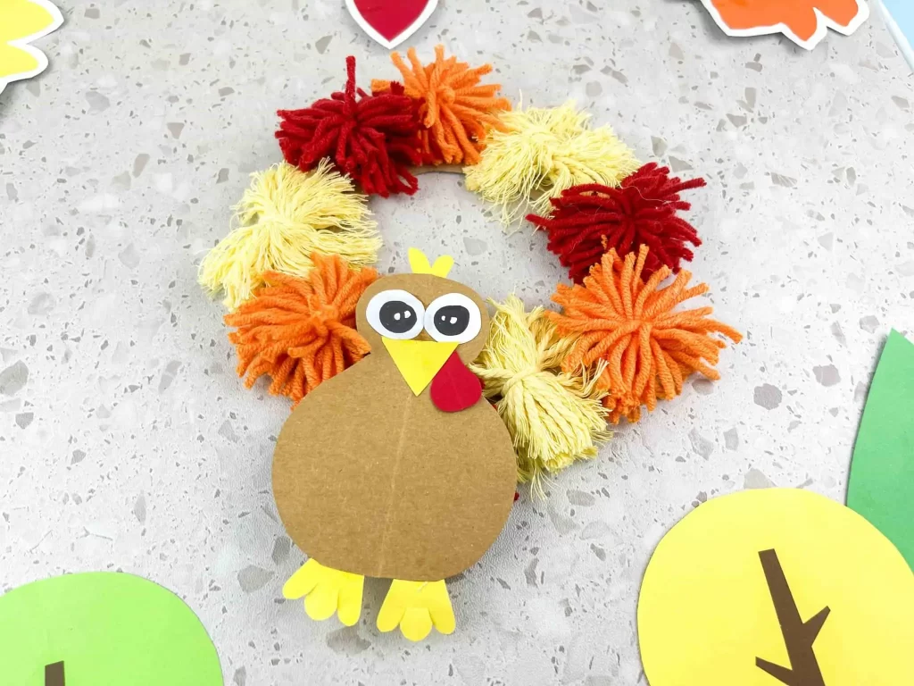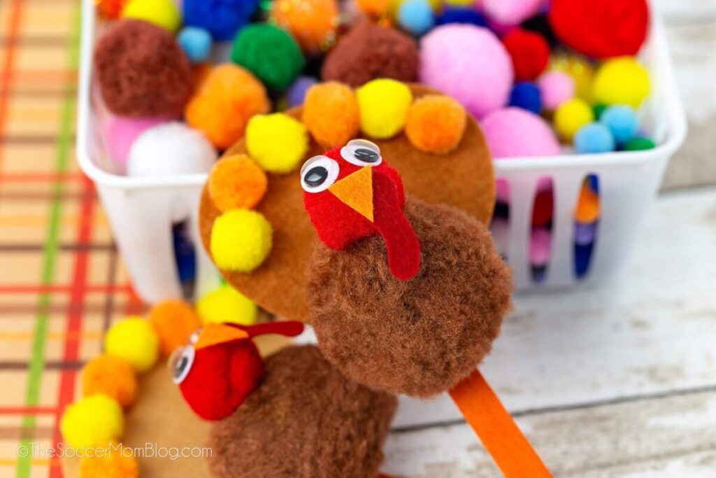 If you’ve got a stash of pom poms, felt, and googly eyes in your craft bin, The Soccer Mom Blog has the perfect way to use them. This pom pom turkey is colorful, silly, and irresistibly cute. It’s the kind of easy afternoon craft that doesn’t require perfection — just creativity and a little glue.