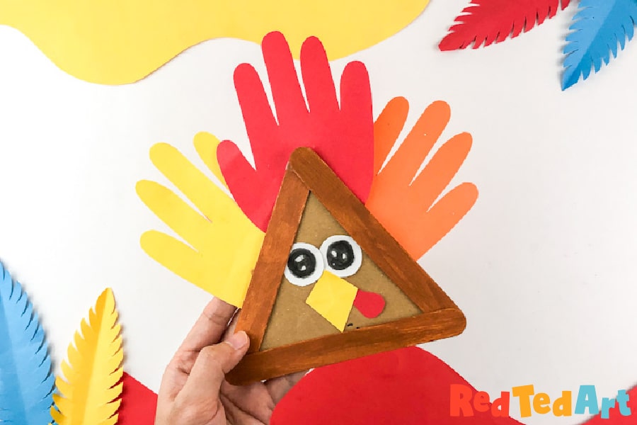 Another fun take on Turkey Handprint Crafts, The Soccer Mom Blog has you covered. This construction paper turkey is another fun keepsake or grandparent gift craft where your cute little ones are turned into little turkeys!