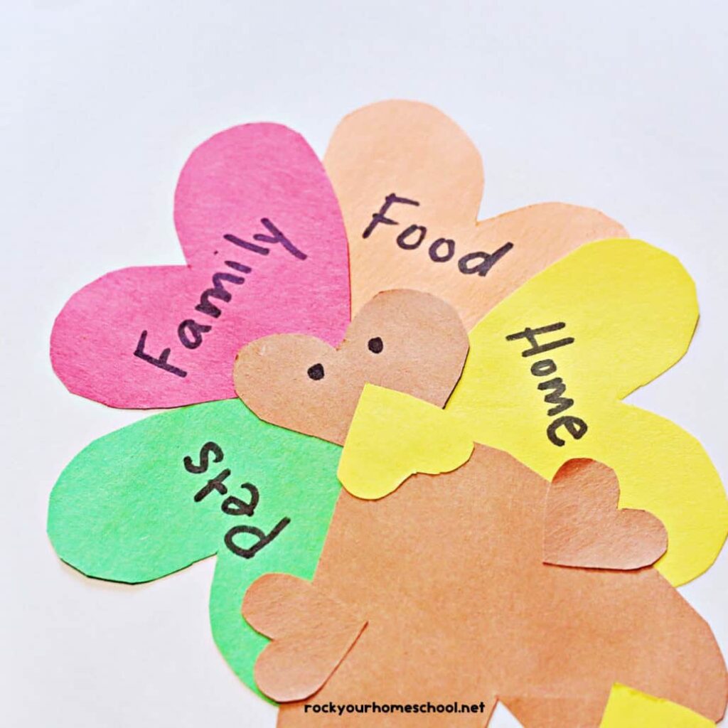This Turkey Name Craft from Simple Everyday Mom is a fun way to sneak in a little learning while crafting. Kids get to spell out their name with each feather, creating their very own personalized turkey. It’s perfect for preschoolers who are just learning their letters or how to spell their name.